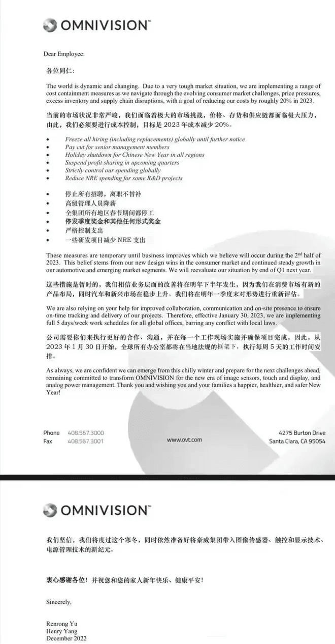延续了近两年的科技公司裁员潮和互联网企业优化潮仍在继续,2023年全球科技业宣布的裁员计划总数目前已超过10万人,接近2022年整年的裁员数量。美国芯片企业豪威集团(OmniVisionGroup)预警,2023年市场需求不乐观,运营将面临极大的挑战,宣布采用停招、降薪等一系列措施控制成本,以使明年成本减少20%,并表示这些措施是暂时的,将在明年一季度末对形势进行重新评估。