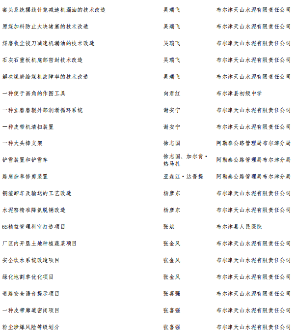 2023年布尔津天山水泥有限责任公司深入开展以“五小”创新活动,有效激活了员工的原动力,强力助推了创优建设。获得维吾尔自治区总工会“五小”优秀创新成果49项,获得维吾尔自治区总工会“五小”示范性优秀创新成果1项。
