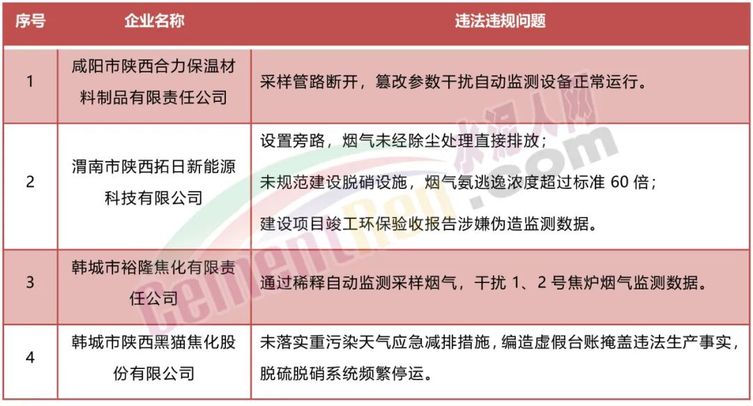 2月21日~22日,生态环境部副部长赵英民带队赴陕西省咸阳市、渭南市和韩城市等空气质量明显反弹城市监督帮扶,对涉气重点企业开展“四不两直”督导检查发现4家企业问题突出: