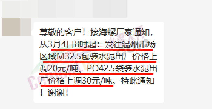 海螺经销商发消息称,接海螺厂家通知,从3月4日8时起,发往温州市场区域M32.5包装水泥出厂价格上调20元/吨、P.O42.5袋装水泥出厂价上调30元/吨。