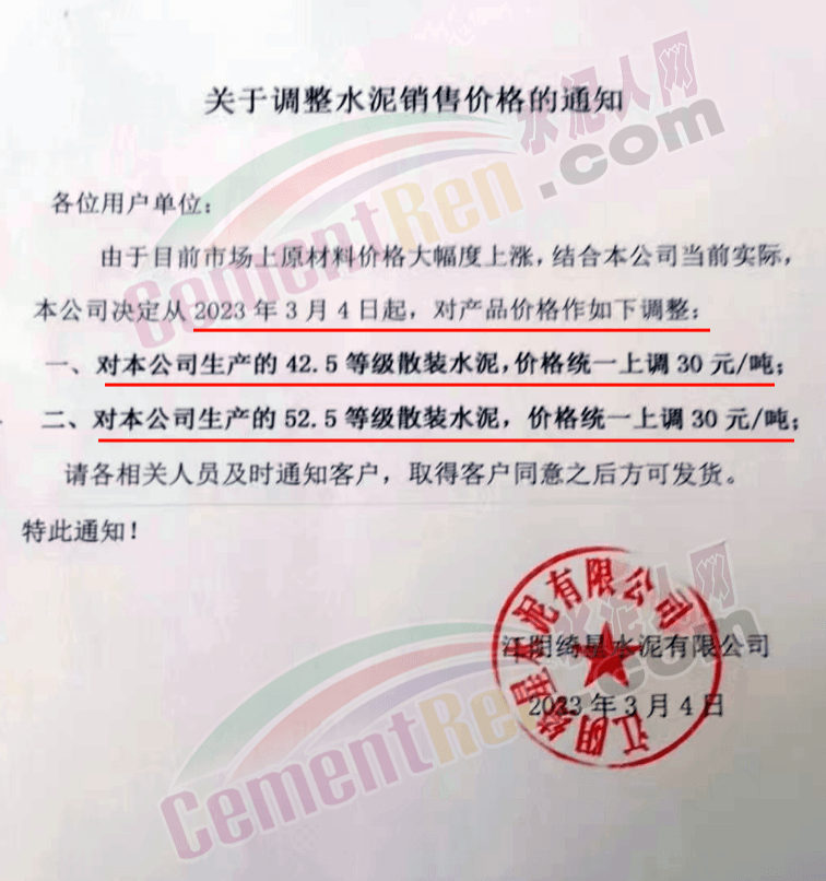 江阴绮星水泥有限公司通知,由于目前市场上原材料价格大幅度上涨,公司决定从3月4日起,对本公司生产的散装水泥价格统一上调30元/吨。