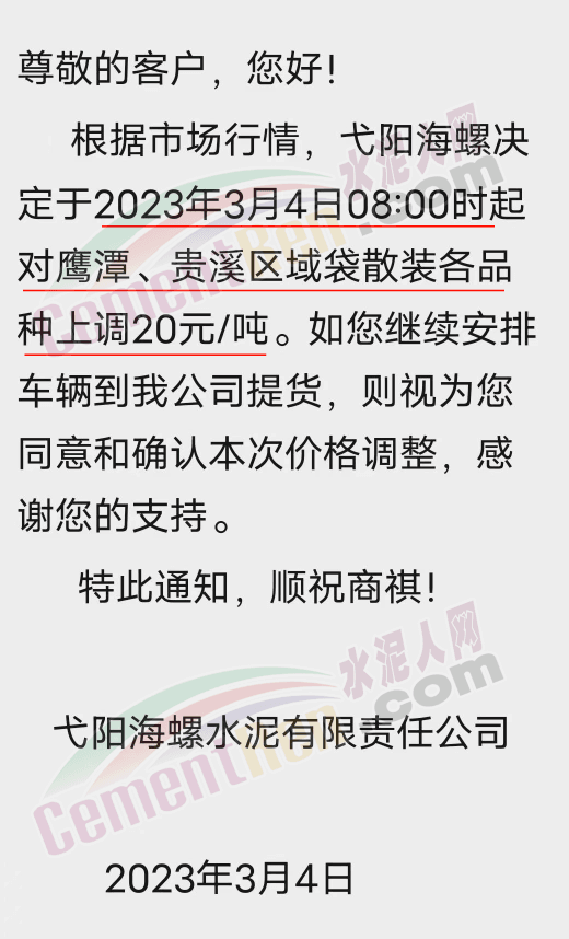 弋阳海螺通知,定于3月4日8时起对鹰潭、贵溪区域各品种水泥价格上调20元/吨。