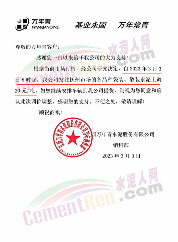 江西万年青水泥股份有限公司通知,根据当前市场行情,经公司研究决定,自2023年3月3日8时起,公司发往抚州市场的各品种袋装、散装水泥上调20元/吨。