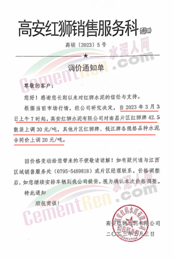 高安红狮水泥销售服务科通知,根据当前市场行情,经公司研究决定,自2023年3月3日上午7时起,高安红狮水泥有限公司对南昌片区红狮牌42.5散装上调30元/吨,其他片区红狮牌、钱江牌各规格品种水泥合同价上调20元/吨。