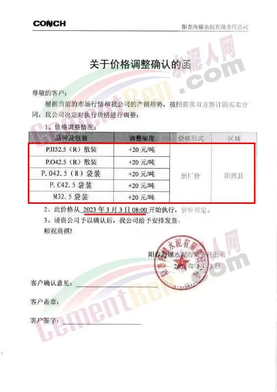 日前,阳春海螺水泥有限责任公司通知,从3月3日8时起各标号水泥阳西县区域出厂价上调20元/吨。