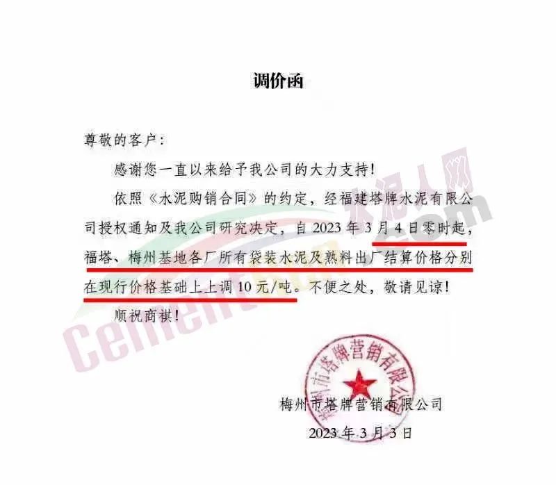 梅州市塔牌营销有限公司通知,自3月4日零时起,福塔、梅州基地各厂所有袋装水泥及熟料出厂结算价格上调10元/吨。