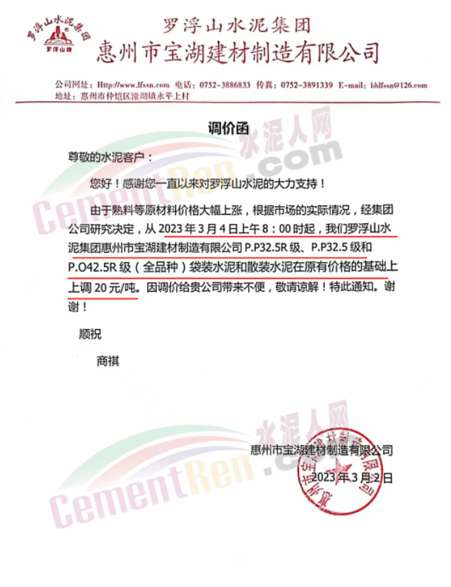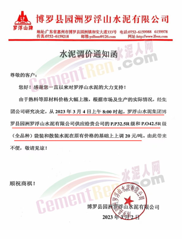 3月4日罗浮山水泥集团惠州市宝湖建材制造有限公司、博罗县园洲罗浮山水泥有限公司PP32.5R级PP32.5级和P.O42.5R级(全品种)袋装水泥和散装水泥上调20元/吨。企业曾于2月23日发函上调上述标号水泥价格20元/吨。两次累计上调40元/吨。
