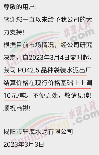 揭阳市轩海水泥有限公司通知,3月4日零时起,P.O42.5袋装水泥出厂价上调10元/吨。
