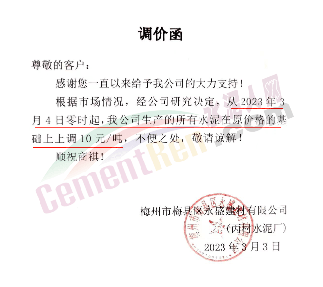 梅州市梅县区永盛建材有限公司通知,3月4日零时起,公司生产的所有水泥在原价基础上上调10元/吨。