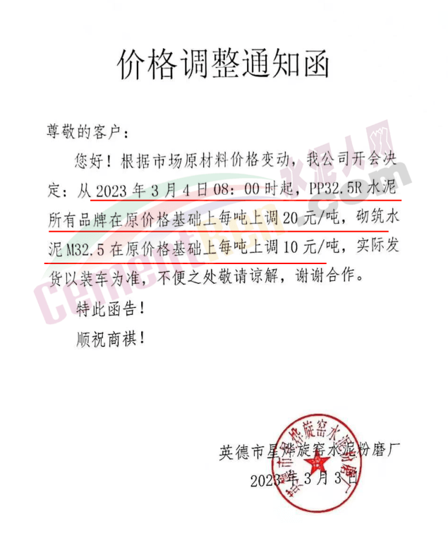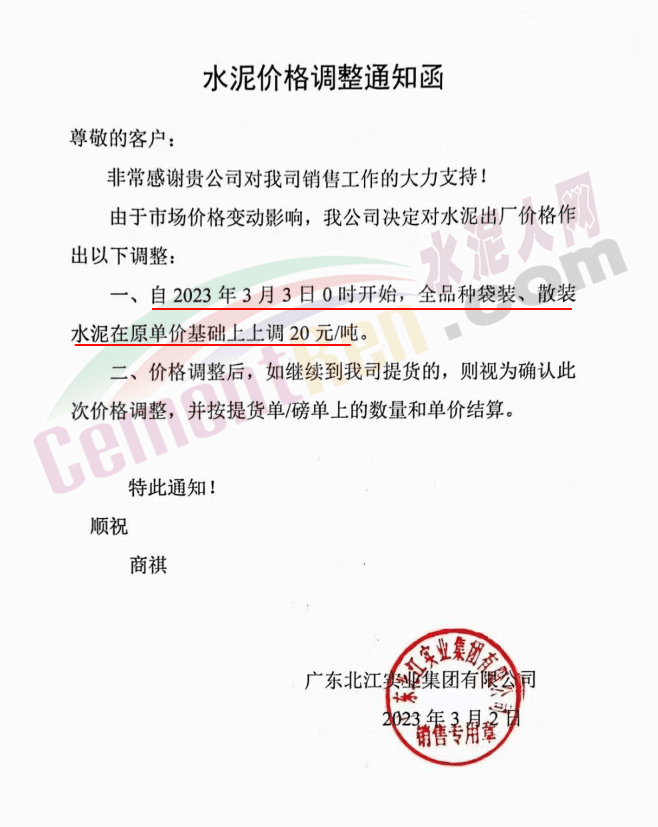 广东北江实业集团有限公司通知,由于市场价格变动影响,公司决定自3月3日0时开始全品种水泥上调20元/吨。