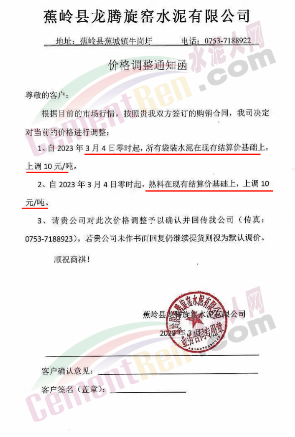 蕉岭龙腾旋窑水泥通知,3月4日零时起,水泥及熟料价格上调10元/吨。