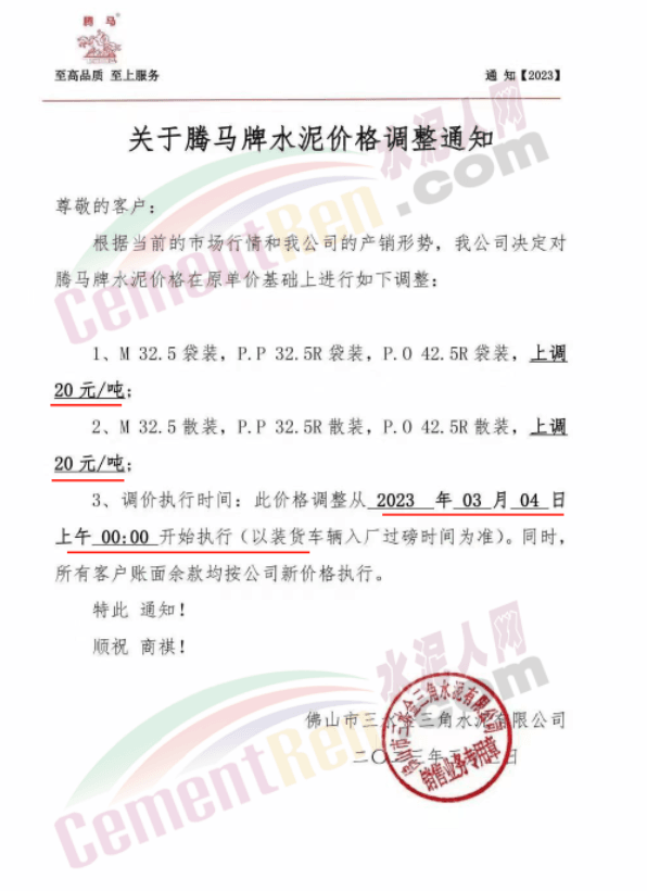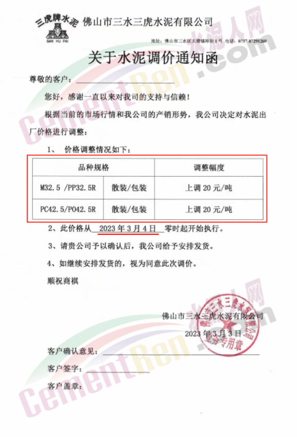 佛山市三水三虎水泥通知,3月4日零时起各标号水泥上调20元/吨。