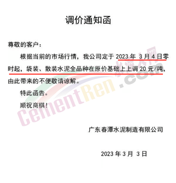 广东春潭水泥制造有限公司通知,3月4日零时起,全品种水泥在原基础上上调20元/吨。
