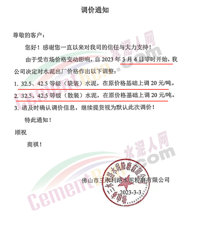 佛山市三水利路水泥粉磨有限公司通知,3月4日零时开始各标号水泥上调20元/吨。