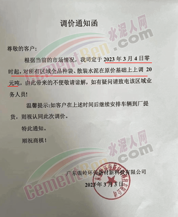 广东银岭环保新材料科技有限公司通知,3月4日对全区域水泥价格上调20元/吨。
