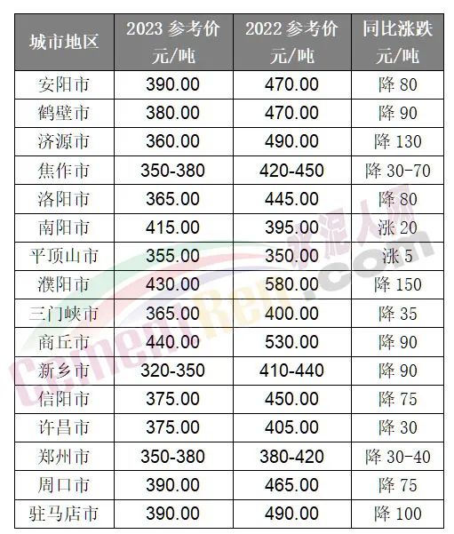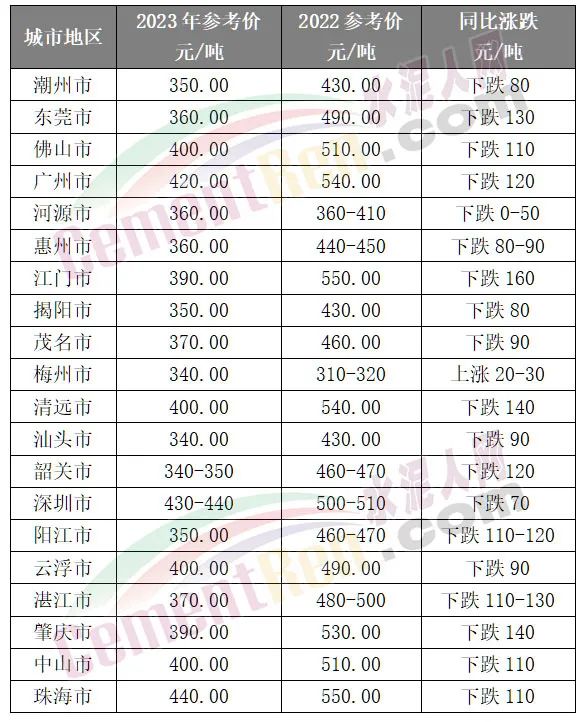 从上述数据可见江门区域2022年3月初报价在550元/吨,目前参考报价还不到400元/吨。梅州市场上年同期报价在310-320元/吨左右,今年3月初报价340元/吨左右,若考虑成本上涨因素,该报价与上年同期仍有差距。