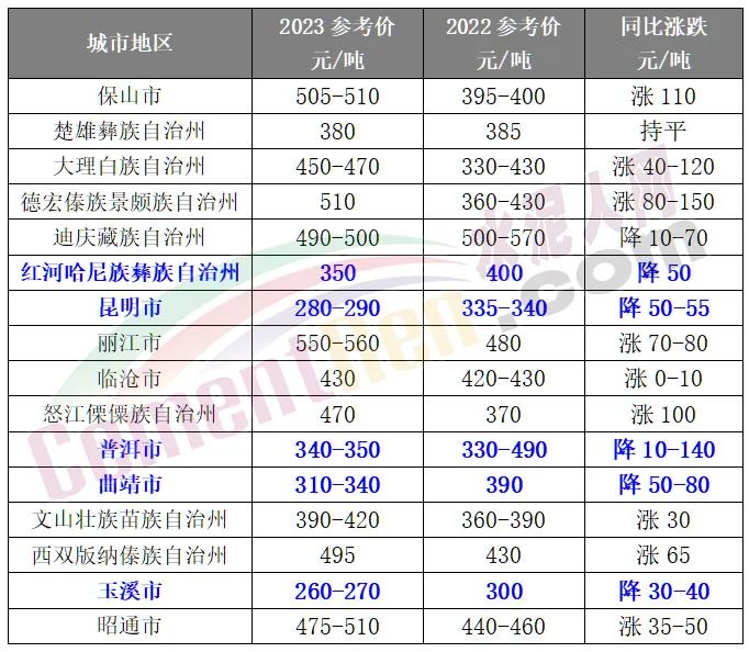 从水泥人网信息中心参考数据可见,云南多个城市地区目前报价较上年同期仍略有上涨,但是迪庆、红河、昆明、普洱、曲靖、玉溪等区域水泥价格较上年同期报价均有不同的下降。其中昆明、玉溪区域水报价均不足300元/吨,普洱、曲靖市报价在350元/吨及以下。而这几个区域正是近期连续发布调价通知的区域。即使是从全国市场来看,低价格洼地也是昆明、玉溪区域。
