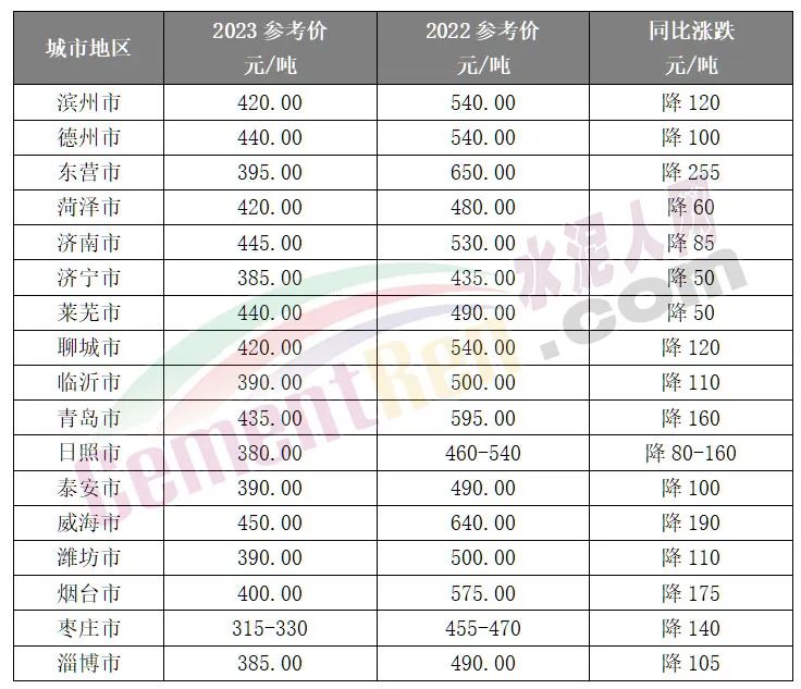 水泥人网信息中心数据显示,山东东营水泥价格较上年同期大跌255元/吨,威海、烟台水泥价格跌190元/吨、170元/吨;日照今年3月初较上年同期报价下跌80-160元/吨,枣庄区域水泥价格也下跌了140元/吨左右。