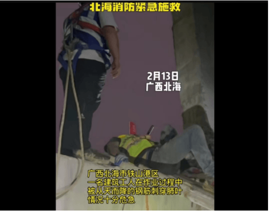 2月13日,铁山港区某水泥厂有一名工人被钢筋贯穿胸部,贯穿工人胸部的钢筋长约2米,而工人被困在一个水泥筒形仓库的窗口处,因及时送医,经过救治已脱离生命危险。