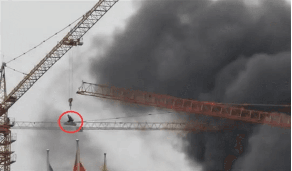 2月22日上午,山东济宁一在建工地发生火灾,一名工人被困塔吊上,随后被其他工人用另一台塔吊救出。有目击者介绍,工人获救约1分钟后,那台塔吊就倒塌了。