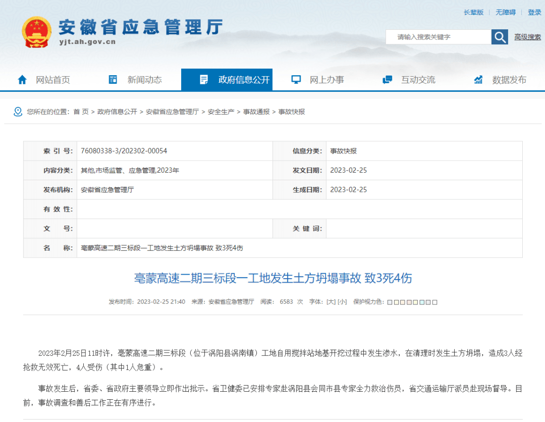 2023年2月25日11时许,亳蒙高速二期三标段(位于涡阳县涡南镇)工地自用搅拌站地基开挖过程中发生渗水,在清理时发生土方坍塌,造成3人经抢救无效死亡,4人受伤(其中1人危重)。