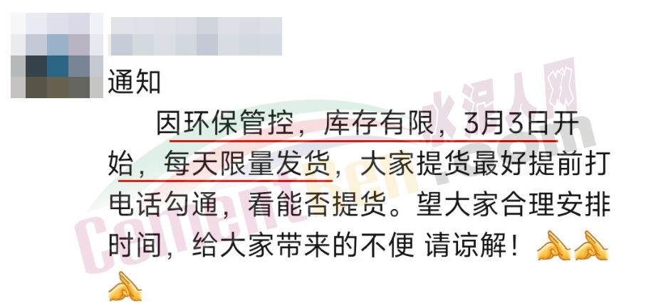 日前,山西某水泥企业发通知称,因环保管控,库存有限,3月3日开始,每天限量发货,请大家提时提前预约。