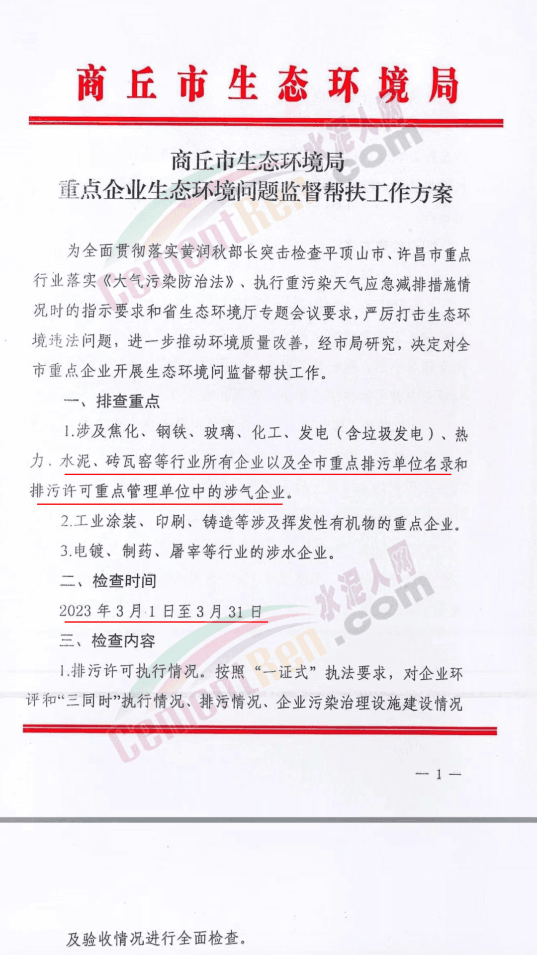 河南商丘3月份大检查,主要针对水泥、砖瓦窑等行业所有企业