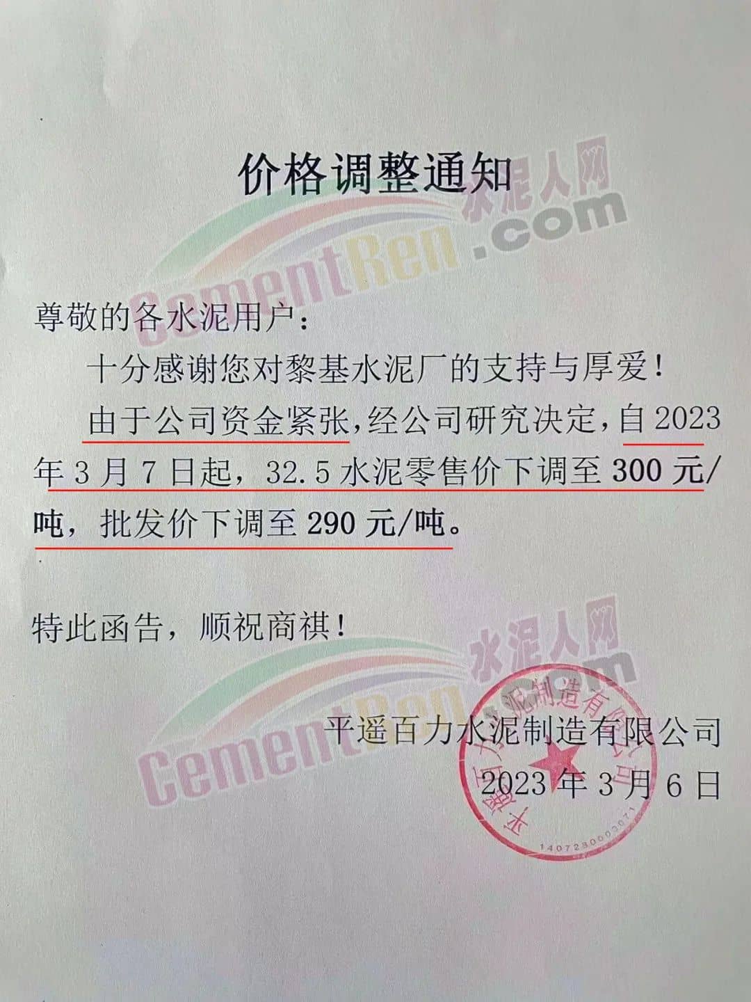 但是,平遥百力水泥制造有限公司却发了张“降价函”。企业价格调整通知称,由于公司资金紧张,自2023年3月7日起,32.5水泥零售价下调至300 元/吨,批发价下调至290元/吨。