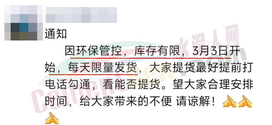 另据水泥人网此前消息,山西长治的一家水泥企业曾发出通知称环保管控,库存有限,即日起限量发货,提货需提前预约。