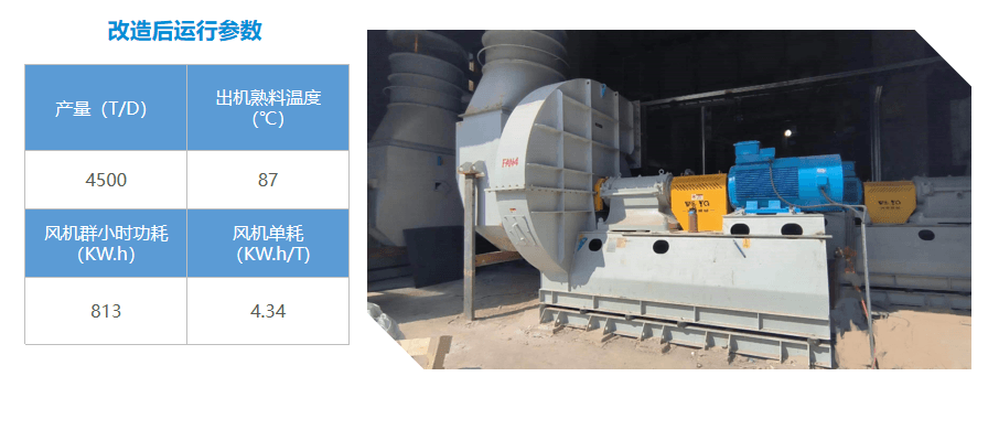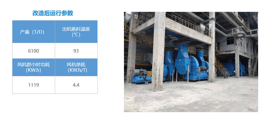 该企业装备两条日产5000吨规模的熟料生产线,2022年推进的A线改造厂家改选用沃亚机械的高效篦冷机冷却风机,投入运行4个月时间,通过三方技术标定,本项目冷却风机运行效率高(风机群整体运行效率>83.8%),冷却电耗表现非常优异,电耗明显优于同类项目,达到国内同类技改最佳水平。