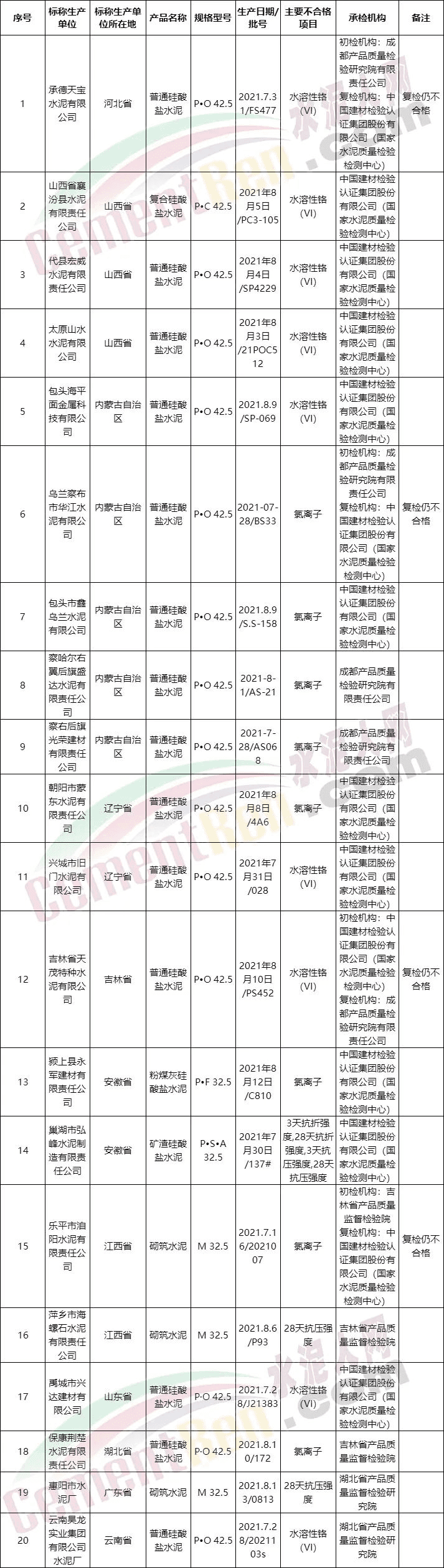 其中,国抽不合格企业名单共包含21家水泥企业。主要不合格项目为抗压、抗折强度以及氯离子和水溶性铬,且不合格企业中4家企业复检仍不合格。
