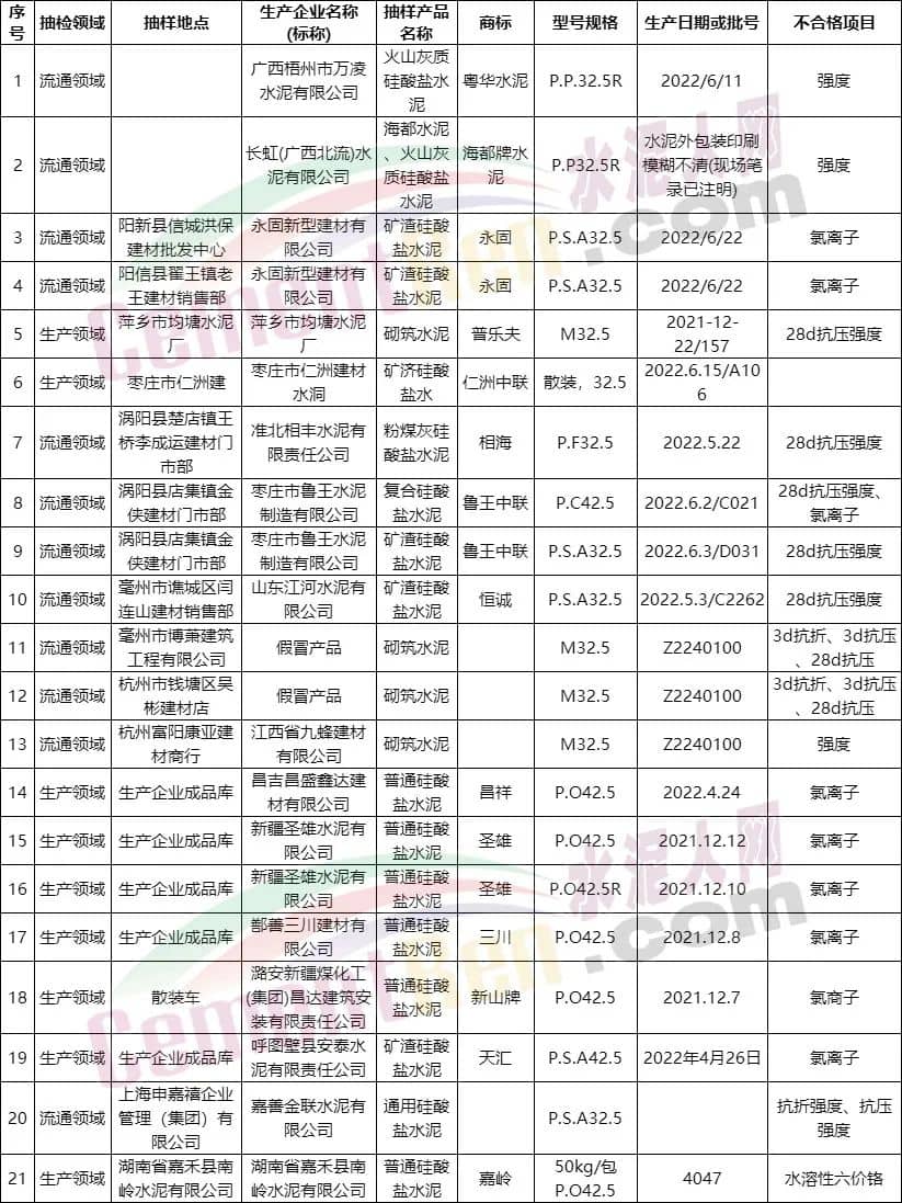 21个批次不合格品中,11个批次强度不合格,9个批次氯离子不合格,1个批次水溶性六价铬不合格。不合品有12个批次是在流通领域被发现,9个批次为生产领域抽检发现。其中包括32.5标号水泥13个批次,42.5水泥8个批次。不合格品中不仅包含高仿品牌、无效注册商标,还存在两批次“假冒产品”。