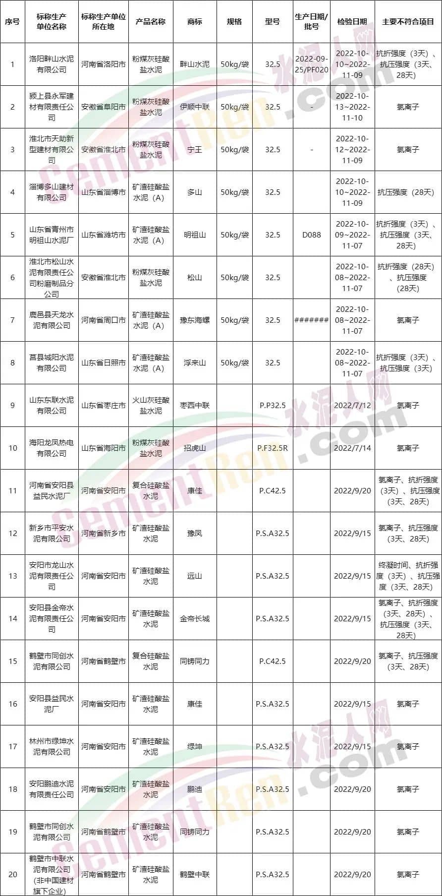 近来各省市地方市场监管总局通报的水泥质量不合格情况显示, 抗压、抗折强度及氯离子不合格仍为“重灾区”,且多出现在市场流通领域。