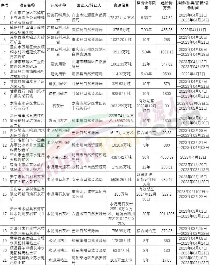 没有矿山就没有成本优势,所谓得矿山者得市场,在激烈的市场竞争中自有矿山被水泥企业认定为实力的象征。据水泥人网不完全统计,近期自然资源部公告挂牌出让的21个矿山项目,拟出让采矿权的矿山项目中出让年限中最长的达30年,起始价达4650.89万元。