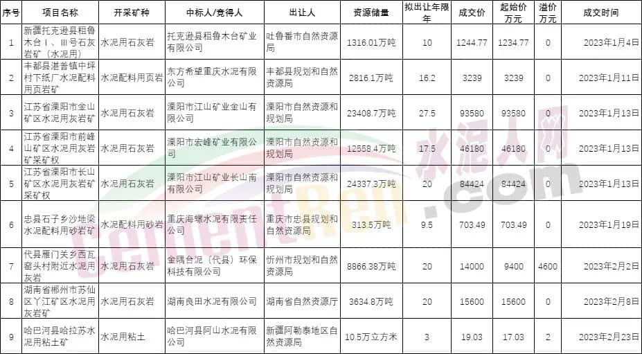 已成交9宗矿山竞得企业包含重庆海螺水泥有限责任公司、金隅台泥(代县)环保科技有限公司、湖南良田水泥有限公司、东方希望重庆水泥有限公司等水泥行业知名企业。