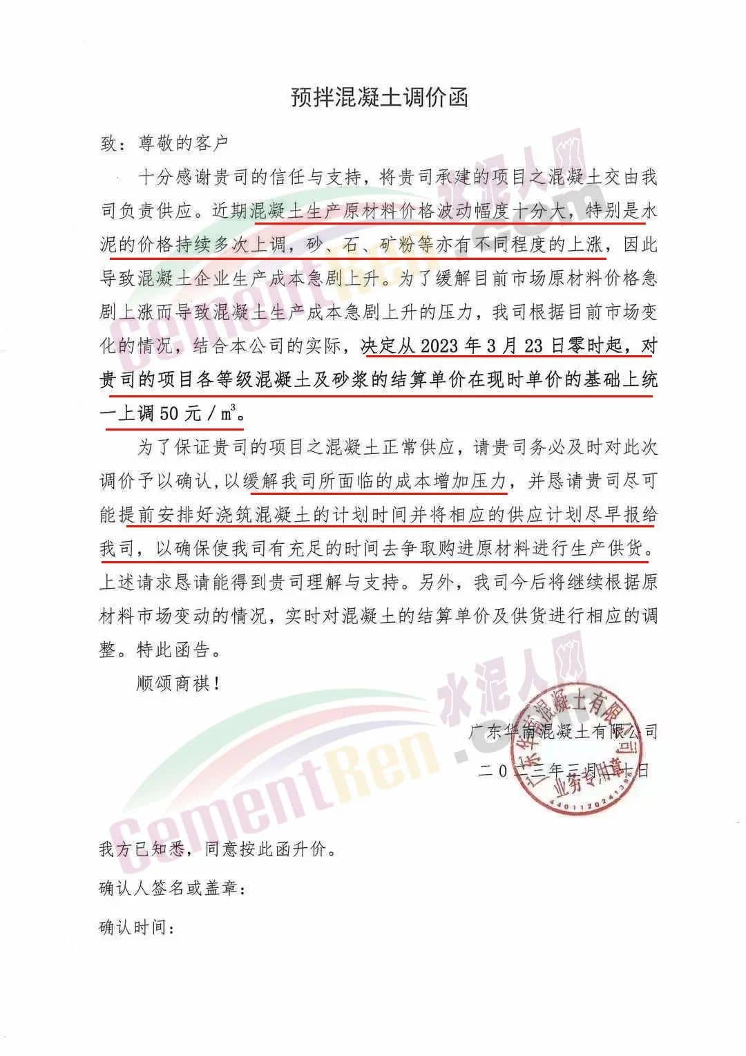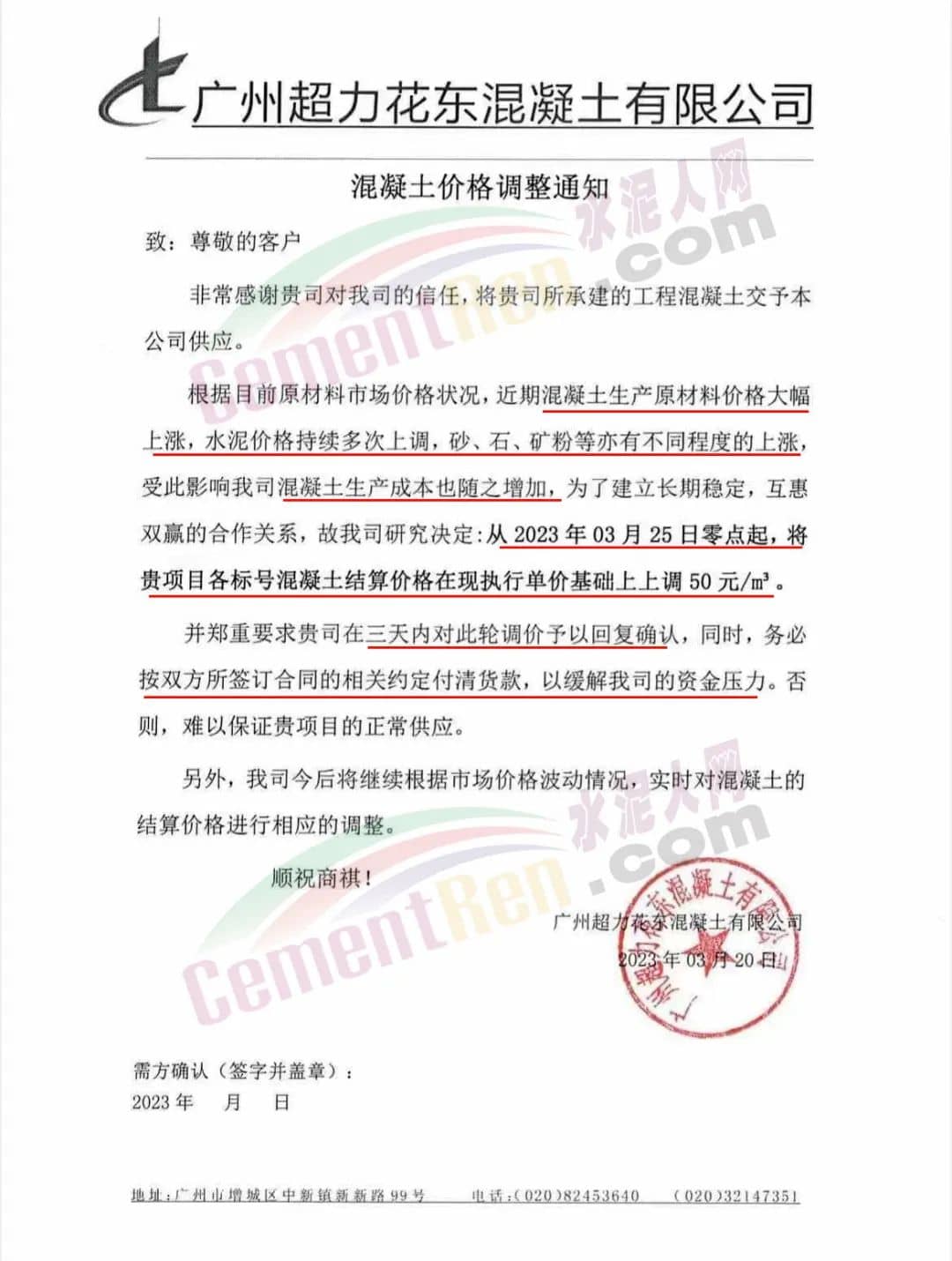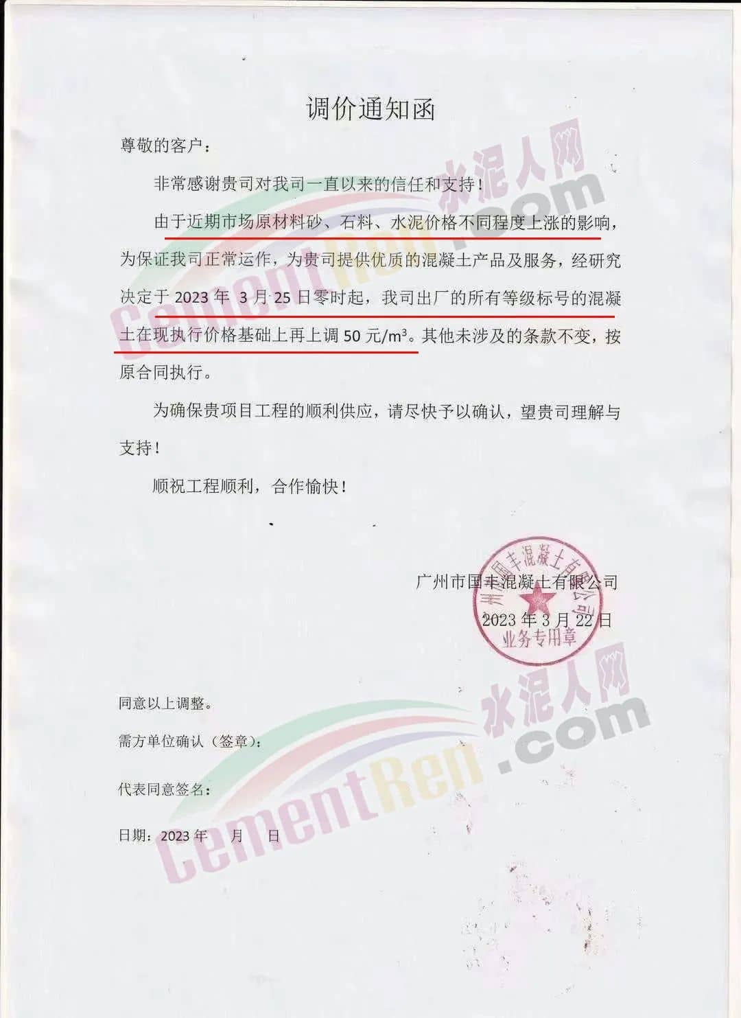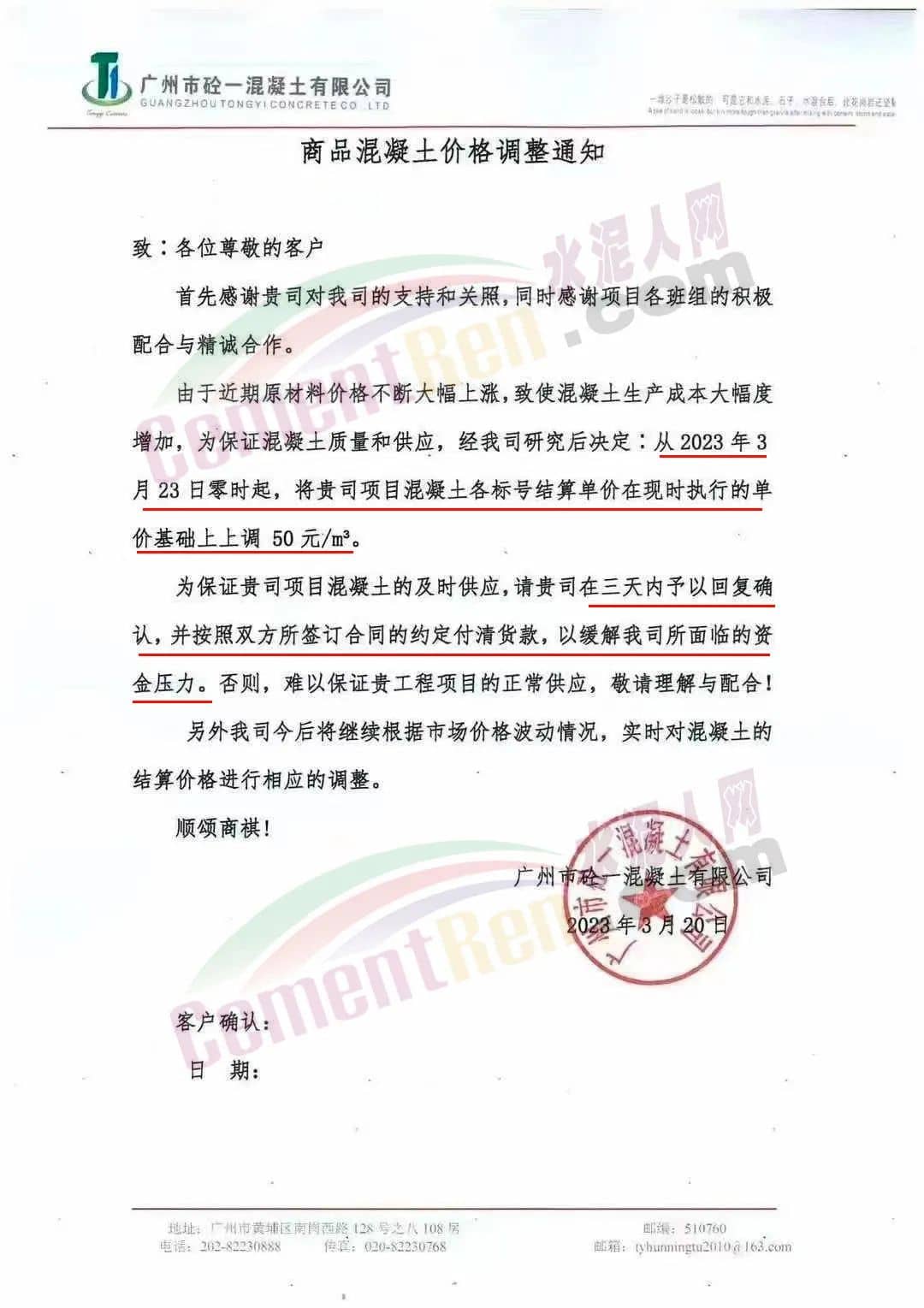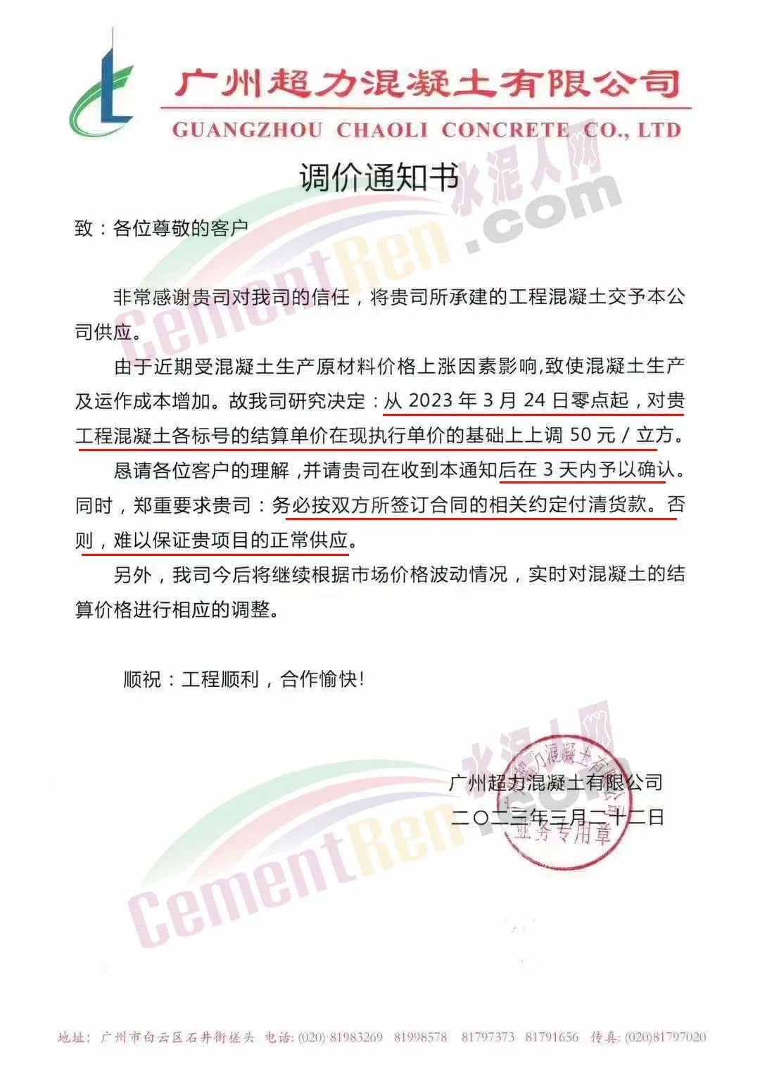 广州市砼一混凝土有限公司通知由于近期原材料价格不断大幅上涨,致使混凝土生产成本大幅度增加,为保证混凝土质量和供应,经公司研究后决定从2023年3月23日零时起,混凝土各标号结算单价在现时执行的单价基础上上调50元/立方。为保证项目混凝土的及时供应,请客户三天内予以回复确认,并按照双方所签订合同的约定付清货款,以缓解公司所面临的资金压力,否则,难以保证工程项目的正常供应。