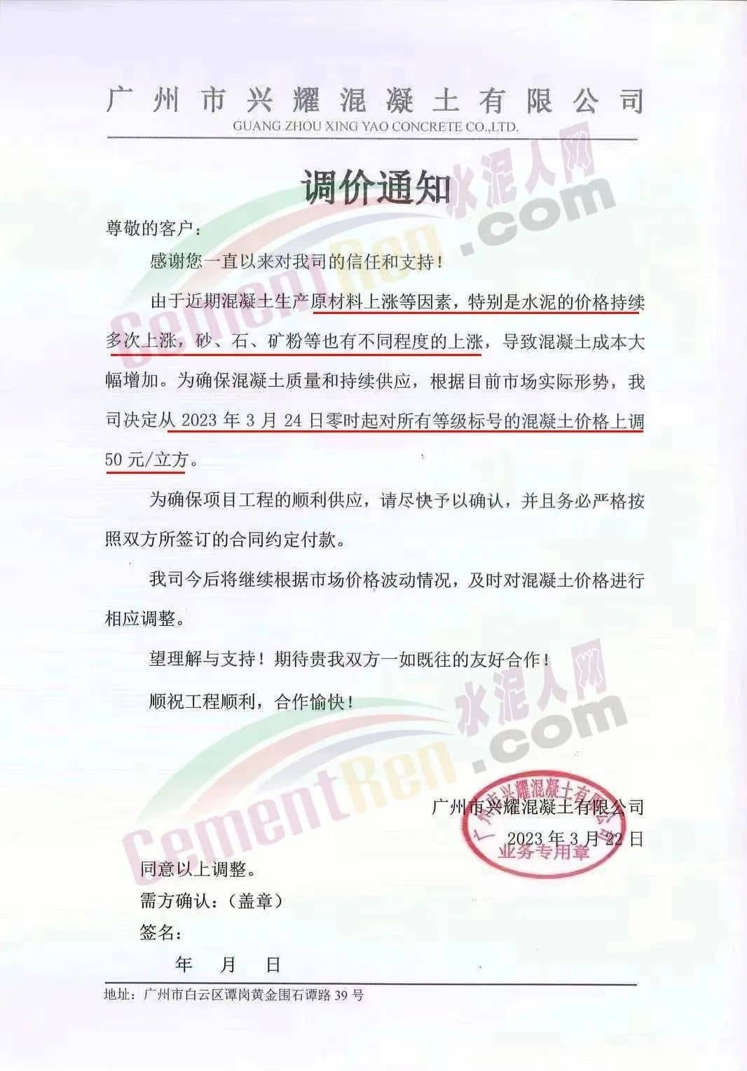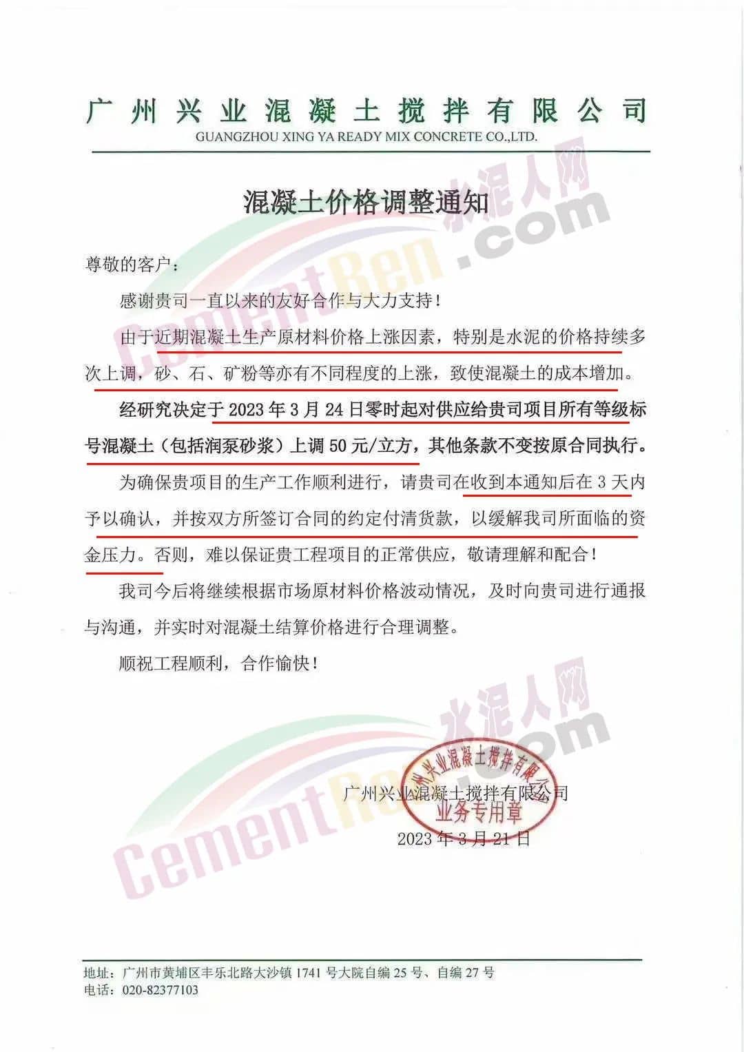 广州兴业混凝土搅拌有限公司通知由于近期混凝土生产原材料价格上涨因素,特别是水泥的价格持续多次上调,砂、石、矿粉等亦有不同程度地上涨,致使混凝土的成本增加。经研究决定于2023年3月24日零时起对所有等级标号混凝土(包括润泵砂浆)上调50元/立方,请客户在收到通知后在3天内予以确认,并按双方所签订合同的约定付清货款,以缓解公司所面临的资金压力,否则,难以保证工程项目的正常供应。