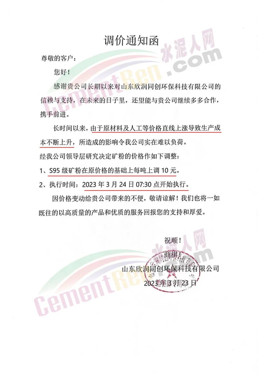 山东欣润同创环保科技有限公司通知,由于原材料及人工等价格直线上涨导致生产成本不断上升,所造成的影响令公司实在难以负荷。经公司领导层研究决定从2023年3月24日7:30点开始S95级矿粉在原价格的基础上每吨上调10元。