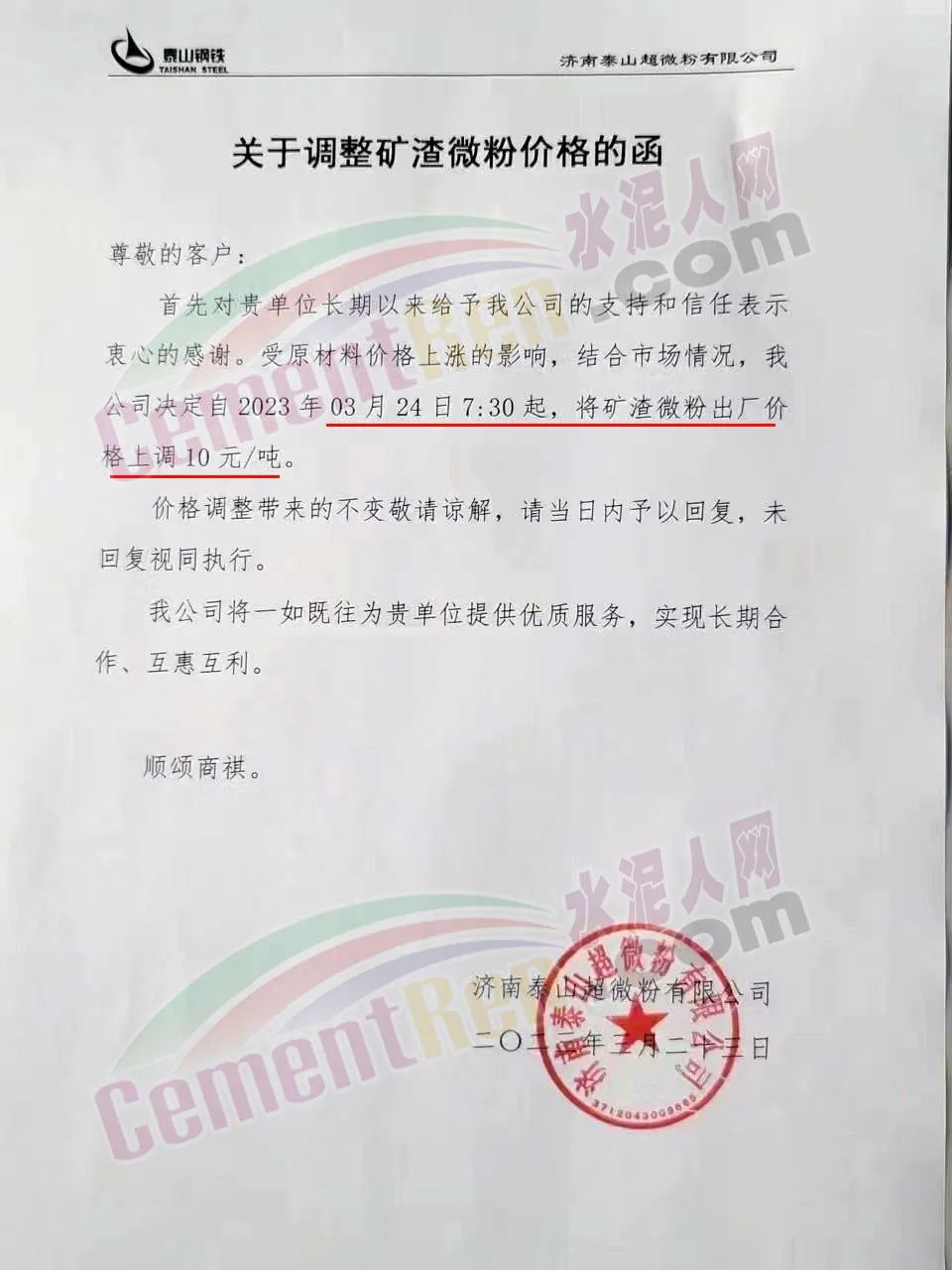 济南泰山超微粉有限公司关于调整矿渣微粉价格的函称,受原材料价格上涨的影响,结合市场情况,公司决定自2023年03月24日7:30起,将矿渣微粉出厂价格上调10元/吨。