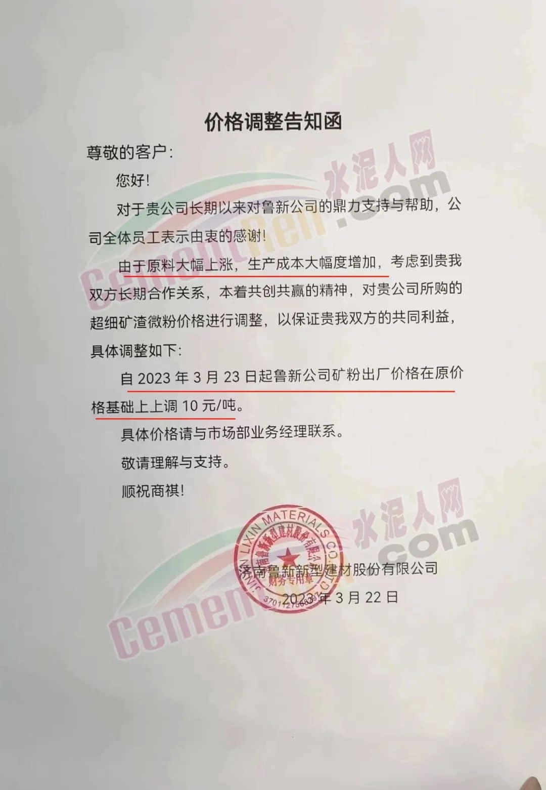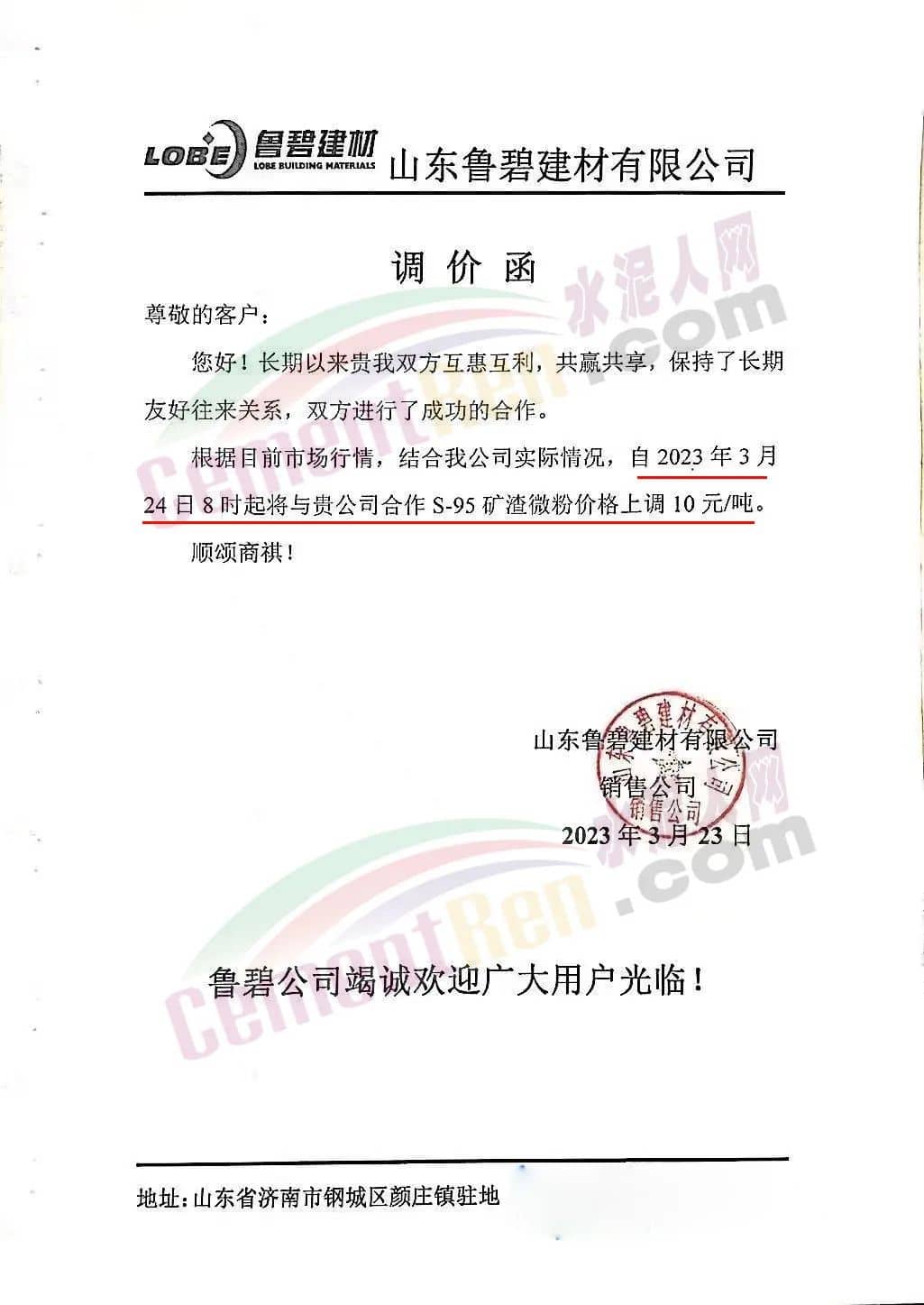 山东鲁碧建材有限公司通知自2023年3月24日8时起将与贵公司合作S95矿渣微粉价格上调10元/吨。