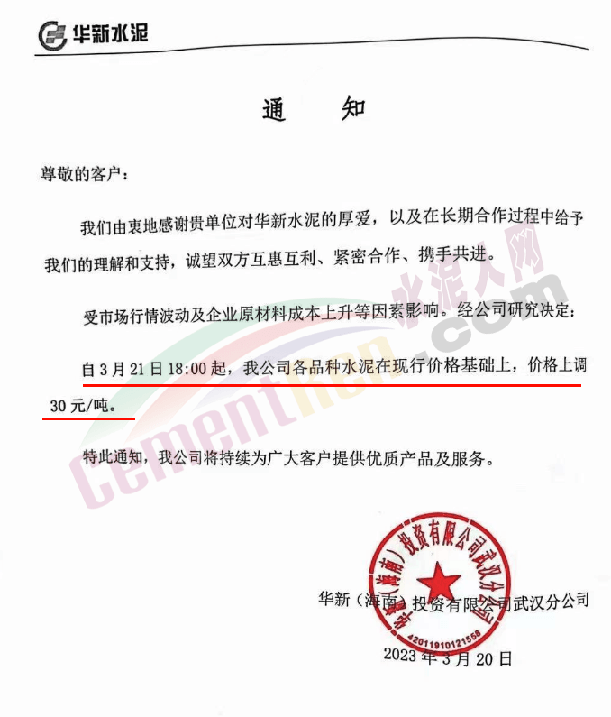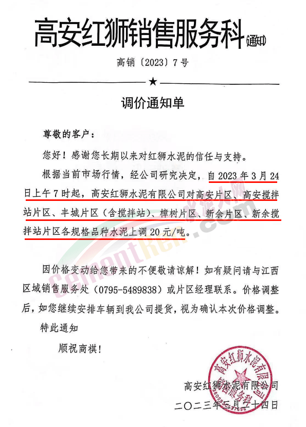 高安红狮销售服务科通知自2023年3月24日上午7时起,对高安片区、高安搅拌站片区、丰城片区(含搅拌站)、樟树片区、新余片区、新余搅拌站片区各规格品种水泥上调20元/吨。