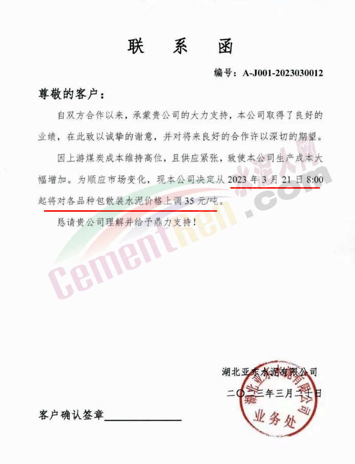 湖北亚东水泥有限公司通知,因上游煤炭成本维持高位,且供应紧张,致使本公司生产成本大幅增加。为顺应市场变化,现本公司决定从2023年3月21日8:00起将对各品种包散装水泥价格上调35元/吨。