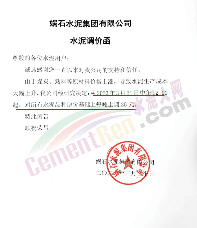 娲石水泥集团有限公司通知,由于煤炭、熟料等原材料价格上涨,导致水泥生产成本大幅上升。公司经研究决定从2023年3月21日中午12:00起,对所有水泥品种原价基础上每吨上调35元。