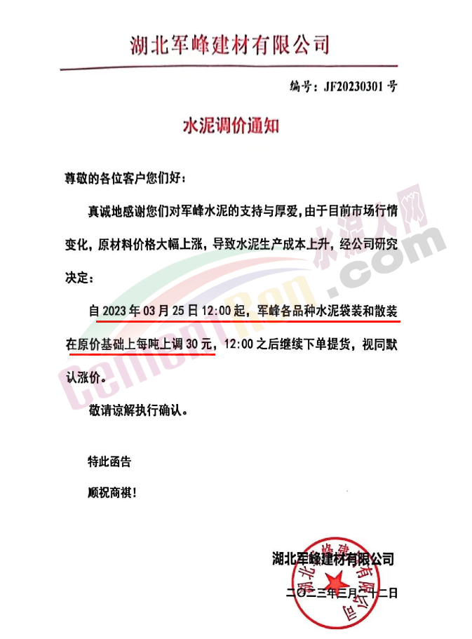 湖北军峰建材有限公司通知,由于目前市场行情变化,原材料价格大幅上涨,导致水泥生产成本上升,经公司研究决定自2023年3月25日12:00起,军峰各品种水泥袋装和散装在原价基础上每吨上调30元。