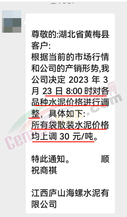 江西庐山海螺水泥有限公司通知,根据当前的市场行情和公司的产销形势,公司决定2023年3月23日8时对各品种水泥价格上调30元/吨。