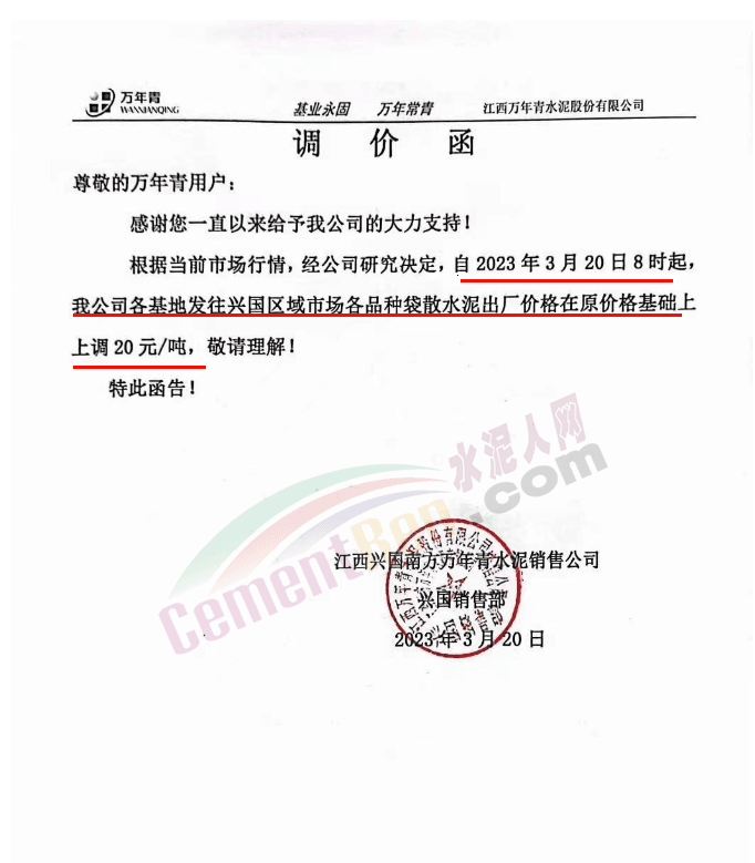 江西兴国南方万年青水泥销售公司通知自2023年3月20日8时起公司各基地发往兴国区域市场各品种袋散水泥出厂价格在原价格基础上上调20元/吨。