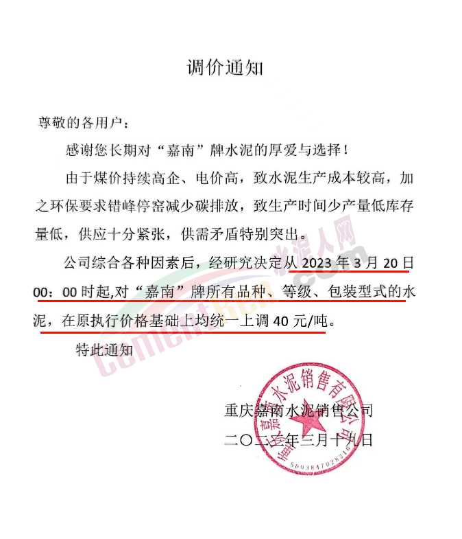 重庆嘉南水泥销售公司通知,由于煤价持续高企、电价高,致水泥生产成本较高,加之环保要求错峰停窑减少碳排放,致生产时间少产量低库存量低,供应十分紧张,供需矛盾特别突出。公司综合各种因素后,经研究决定从2023年3月20日0时起,对“嘉南”牌所有品种、等级、包装型式的水泥,在原执行价格基础上均统一上调40元/吨。