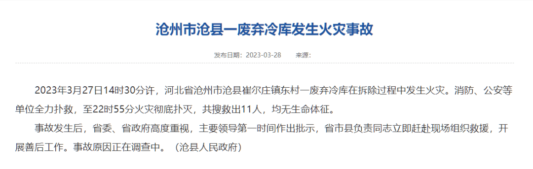 据河北省沧州市沧县人民政府官网28日消息, 2023年3月27日14时30分许,河北省沧州市沧县崔尔庄镇东村一废弃冷库在拆除过程中发生火灾。消防、公安等单位全力扑救,至22时55分火灾彻底扑灭,共搜救出11人,均无生命体征。