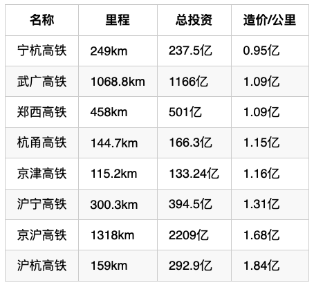 高铁的成本有多高?我们根据公开的资料,整理的部分高铁成本,如下表所示。