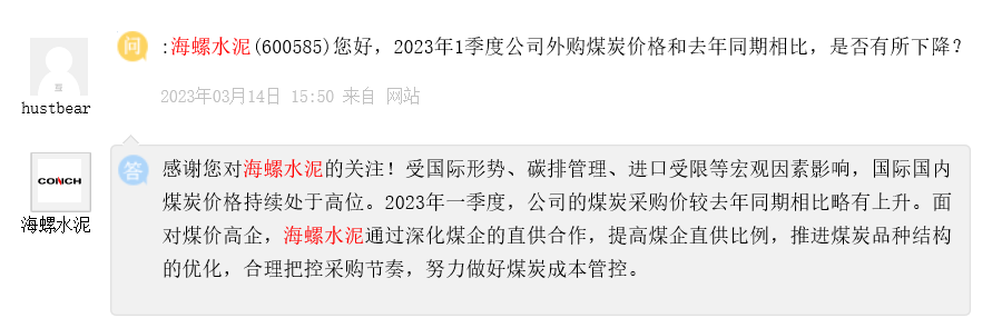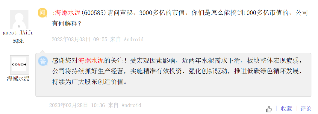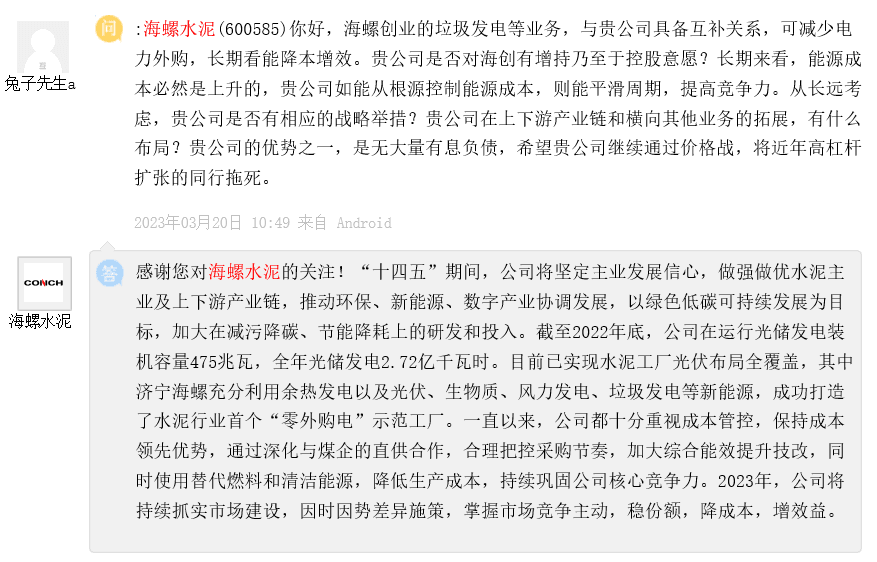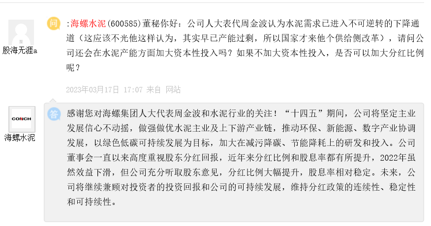 3月27日晚间,海螺水泥发布2022年年报,或因其业绩下滑幅度较大,多位投资者在上市平台针对海螺水泥市值蒸发1000多亿以及2023年业绩发展、采购成本、海外投资、产品细节提问,甚至的投资者表示希望海螺水泥继续通过价格战,将近年高杠杆扩张的同行拖死。28日海螺水泥上市公司集中回复了多位投资者提问。